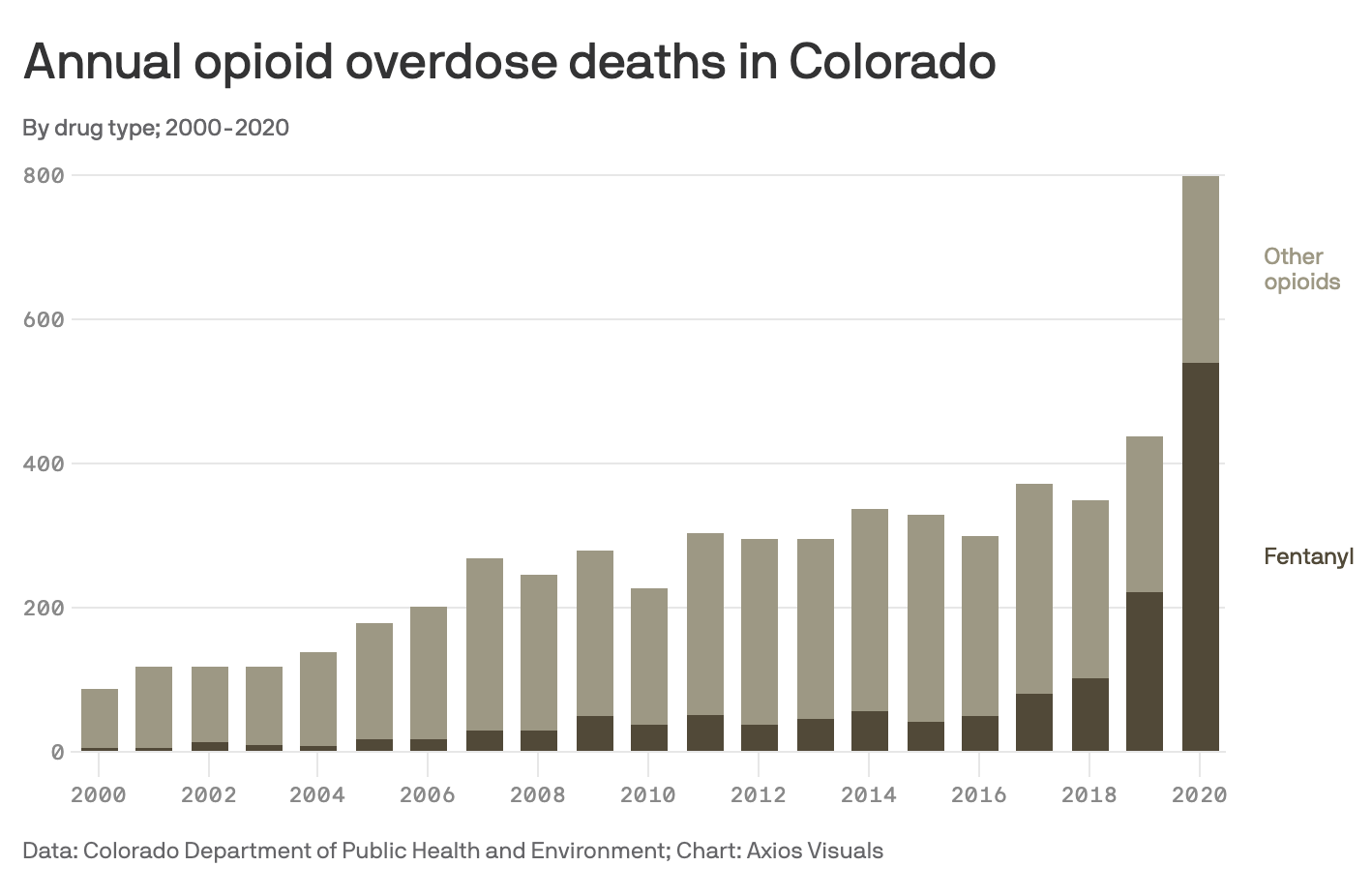 First, let me legitimize the rationale behind the argument these unusually respected politicians are making. As the CDC has pointed out repeatedly, deaths from illicit drugs are trending upward, and recently topped 100,000 for the first time. Diplomatic pressure is rising to curtail the manufacturing of fentanyl, which is 50 times more potent than heroin. If you’re looking for a harrowing portrayal of what a worst case future might look like in our cities, you might read this NYT article about what xylazine, an animal sedative and fentanyl mix, is doing to vulnerable populations in Philadelphia. Here in Colorado, fentanyl deaths are rising faster than almost anywhere else in the U.S.